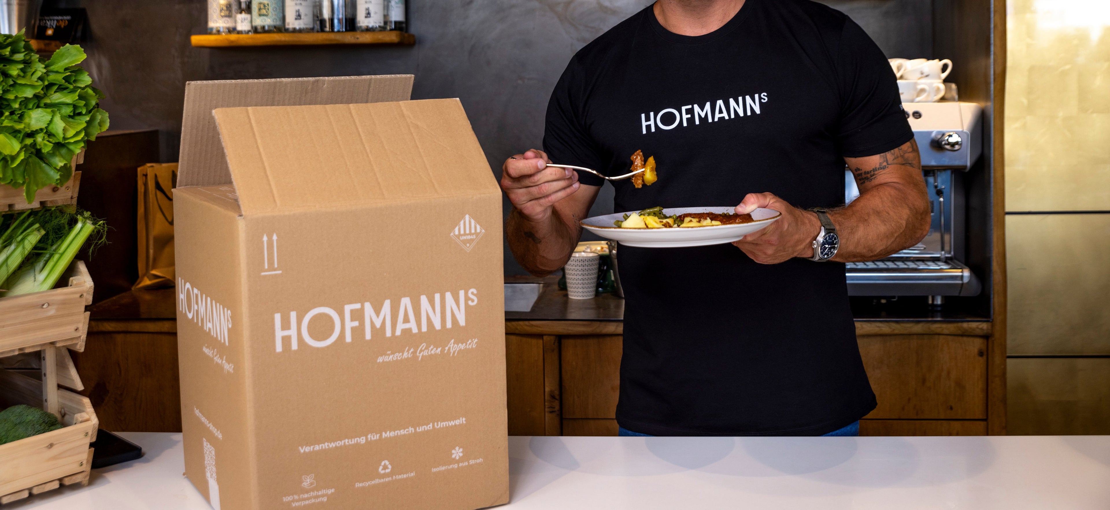 Rabattgutschein der Firma Hofmann mit gelbem Prozentsymbol links und dunkelgrüner Karte rechts.