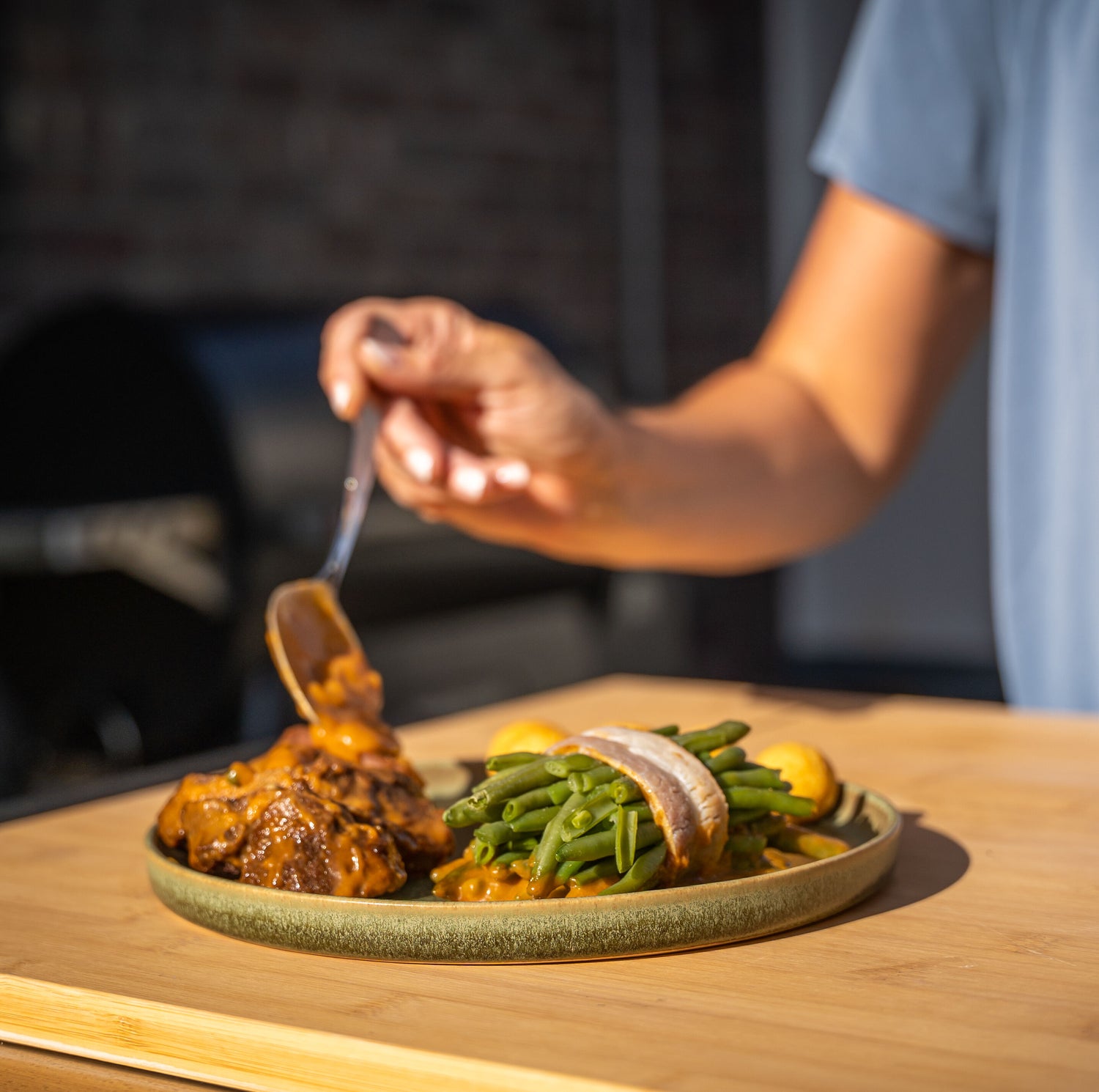 Gourmet-Menü mit Steak, Bohnen, Käsebällchen und Soße auf einem weißen Teller, neben Besteck und Rotwein.