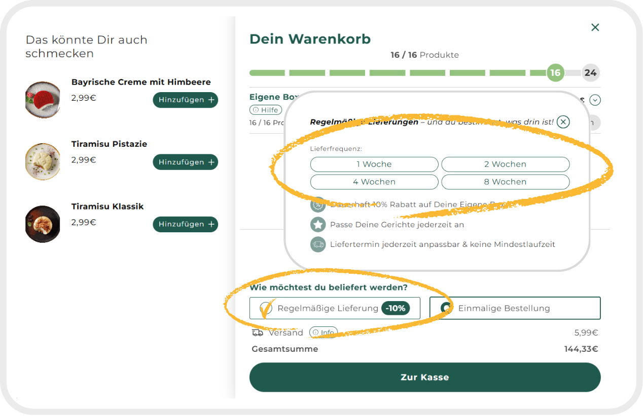 Um Deinen Warenkorb zu füllen, wähle eine fertige Themenbox aus oder erstelle Dir deine individuelle 8er Box mit ausgewählten Gerichten.